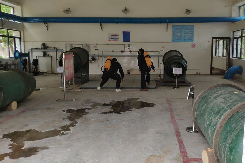 演練開始前,三水廠負責人對全廠職工進行了防火滅火知識培訓,并安排專人詳細講解了消防水袋、滅火器和呼吸機的使用方法。活動中,參演人員還分批次進行了滅火和漏氯預防實戰(zhàn)演練。