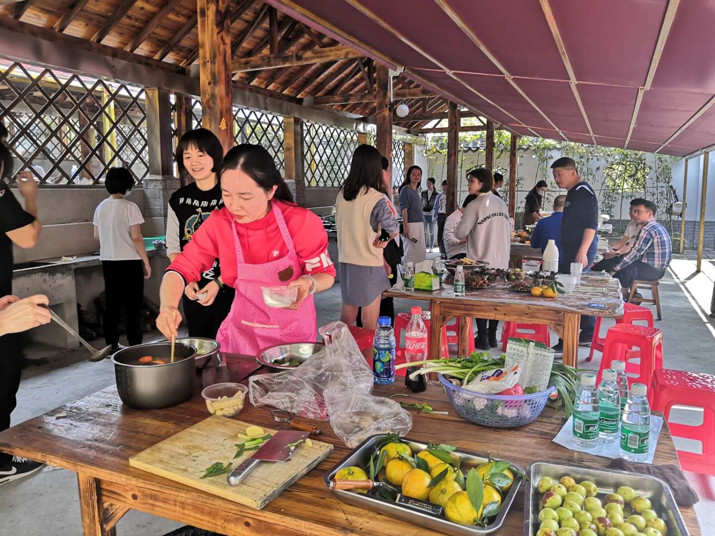 經(jīng)過兩個(gè)小時(shí)的緊張忙碌,一道道色香味俱全的美味佳肴陸續(xù)展示在大家面前。雖然都是家常菜,但品嘗著用自己汗水換來的勞動成果,一個(gè)個(gè)喜笑顏開,大家像一家人一樣,圍坐在一起,互品互贊,其樂融融。