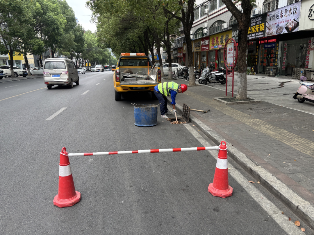 排水公司運(yùn)維人員正在開(kāi)啟雨水箅蓋進(jìn)行清淤
