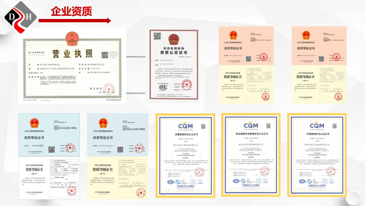 大衡公司持有湖北省市場監(jiān)督管理局評審中心頒發(fā)的CMA計量認證證書(共340項參數(shù)),具有水利工程檢測資質(zhì)巖土、混凝土甲級;量測、金屬結(jié)構(gòu)和機械電氣類乙級。業(yè)務范圍涵蓋水庫除險加固、灌區(qū)續(xù)建配套與節(jié)水改造、泵站更新改造、堤防工程、河道治理、農(nóng)村安全飲水、土地復核等多個領域,連續(xù)四年承擔湖北省水利廳水利工程飛檢任務,以誠信經(jīng)營與專業(yè)服務樹立行業(yè)口碑。