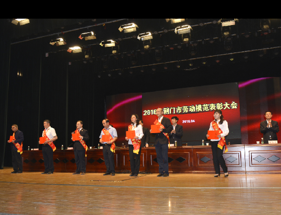 荊門(mén)市勞動(dòng)模范、供水總公司黨委書(shū)記、總經(jīng)理陳永根(右二)上臺(tái)接受頒獎(jiǎng)。