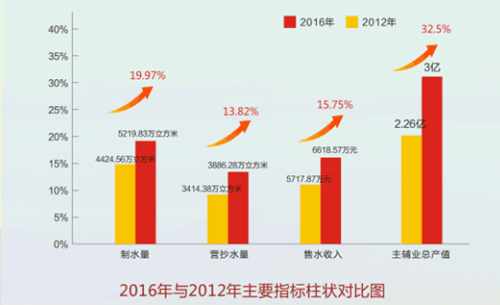 2016年制水量達(dá)5219.83萬(wàn)立方米,較2012年制水量4424.56萬(wàn)立方米增長(zhǎng)19.97%;營(yíng)抄水量3886.28萬(wàn)立方米,同比3414.38萬(wàn)立方米增長(zhǎng)13.82%;售水收入6618.57萬(wàn)元,同比5717.87萬(wàn)元增長(zhǎng)15.75%;2016年公司主輔業(yè)總產(chǎn)值創(chuàng)歷史新高,首次突破3億元,同比2.26億元增長(zhǎng)32.5%。