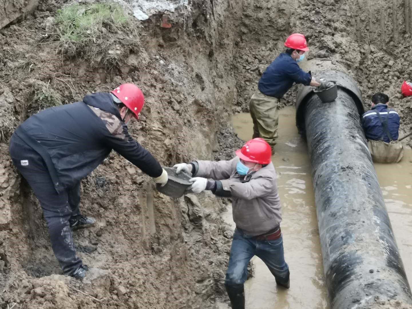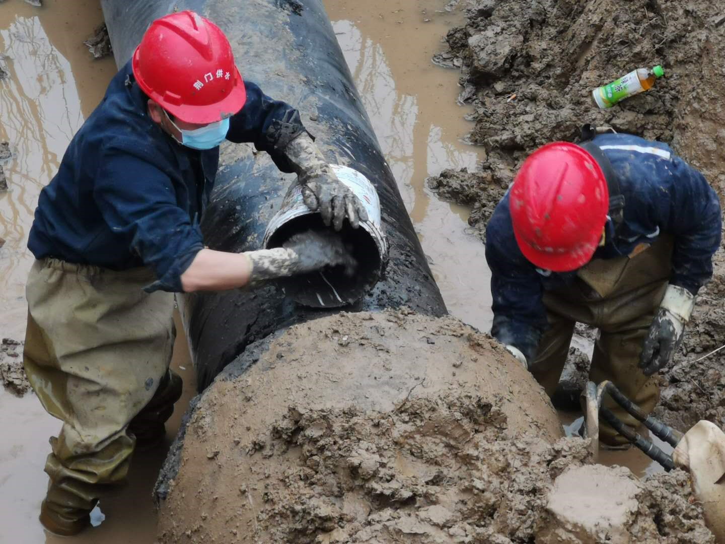 2月23日10時,掇刀區(qū)迎春大道人福藥業(yè)門前DN600mm主供水管道突發(fā)爆管,供水維修部門迅速啟動疫情期間應(yīng)急搶修預(yù)案,組織人員、工程機(jī)械、維修設(shè)備趕赴現(xiàn)場,經(jīng)過9個多小時的緊張搶修,于當(dāng)日晚7點(diǎn)42分恢復(fù)了供水。緊接著次日8點(diǎn),東寶區(qū)科陽路DN600mm主供水管道突發(fā)爆管,巡查人員現(xiàn)場核實(shí)后迅速止水,并及時通告用戶停水信息后開始倒閘排水,到13時左右開挖出爆管的DN600的主供水管道出現(xiàn)在大家面前,相比前日的搶修,整段水管因裂口較大損壞嚴(yán)重,不能簡單修復(fù),只能現(xiàn)場立即制定可靠的管道更換維修方案。當(dāng)時,全部工作人員從早上到現(xiàn)場已經(jīng)工作了5個小時,滴水未進(jìn),但大家為保障搶修進(jìn)度,仍然堅(jiān)持一邊加班加點(diǎn)對基坑進(jìn)行處理,一鼓作氣將破損管道清理出來,做好對接管道的清淤工作。另一邊搬運(yùn)快干水泥,切割、加工、運(yùn)輸、吊裝管道,14點(diǎn)35分把全部材料物資運(yùn)抵現(xiàn)場開始作業(yè)。隨后,大家在泥地里匆匆啃了幾口方便面后,又投入到緊張的搶修工作中,終于在18點(diǎn)17分完成了維修,待水泥養(yǎng)護(hù)好后,于21點(diǎn)27分通水,及時保障了科陽路企業(yè)和周邊居民的正常生產(chǎn)生活用水。