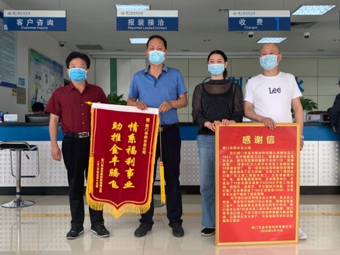 5月15日上午,荊門市金豐新材料有限公司總經理袁家群和東寶區(qū)工商聯(lián)相關負責人來到市供水總公司,送上感謝信和寫有“情系福利事業(yè) 助推金豐騰飛”的鮮艷錦旗,以感謝市供水總公司想企業(yè)之所想、急企業(yè)之所急,用實際行動踐行初心使命,助推企業(yè)復工復產。