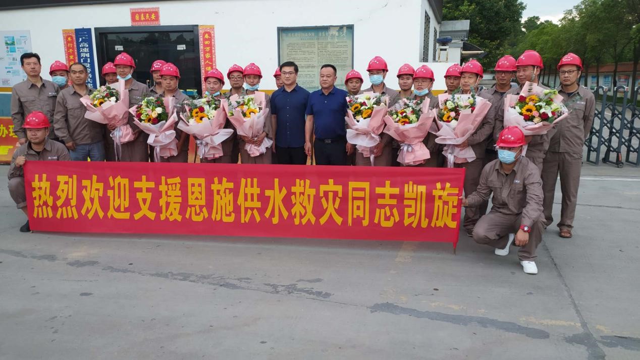7月27日晚7時(shí),市供水總公司逆行出征恩施市的應(yīng)急供水救援隊(duì)全部平安凱旋。公司黨委委員、副總經(jīng)理曾波帶領(lǐng)相關(guān)負(fù)責(zé)人趕往荊門北高速公路出口迎接,獻(xiàn)上鮮花感謝8名隊(duì)員勇往直前,不畏艱險(xiǎn),圓滿完成了這次艱巨的供水救援任務(wù)。