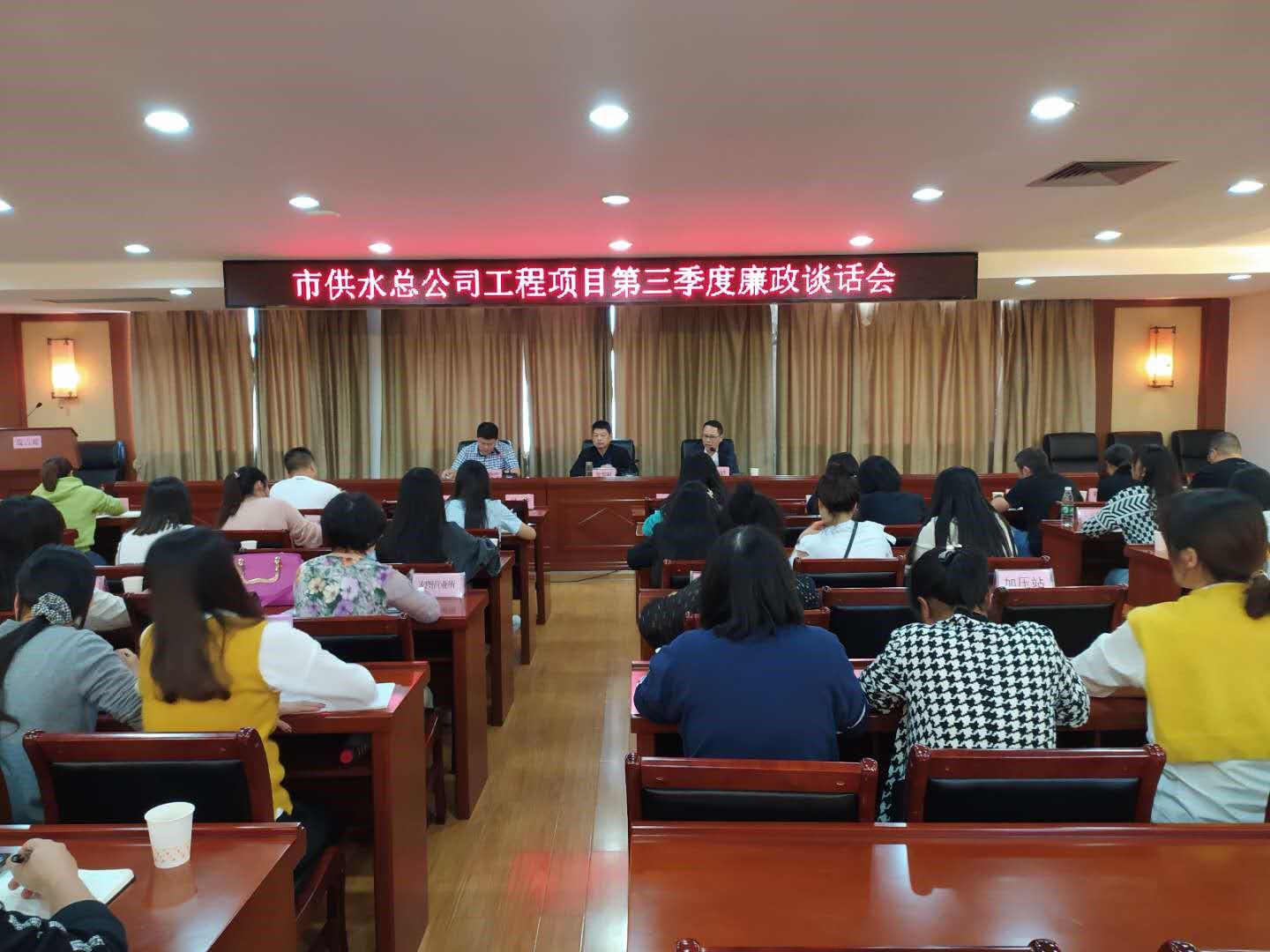 為進(jìn)一步做好財(cái)務(wù)工作,提高財(cái)務(wù)人員廉政意識(shí),防范財(cái)務(wù)風(fēng)險(xiǎn),9月24日下午,市供水總公司舉行工程項(xiàng)目(財(cái)務(wù)管理方面)第三季度廉政談話會(huì)。公司黨委副書記、紀(jì)委書記徐黎明主持會(huì)議,黨委委員、總會(huì)計(jì)師劉高軼進(jìn)行廉政談話,總公司財(cái)務(wù)部全體工作人員、各獨(dú)立核算二級(jí)單位財(cái)務(wù)分管負(fù)責(zé)人和全體財(cái)務(wù)人員、非獨(dú)立核算二級(jí)單位和機(jī)關(guān)各部門報(bào)賬員,公司紀(jì)委委員、各支部紀(jì)檢委員參加會(huì)議。