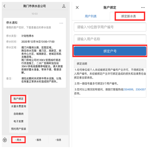 1.進入“荊門市供水總公司”微信公眾號,點擊“用水”,選擇“賬號綁定”,點擊“綁定新水表”,輸入10位數(shù)字用戶編號、用戶名稱綁定戶號。